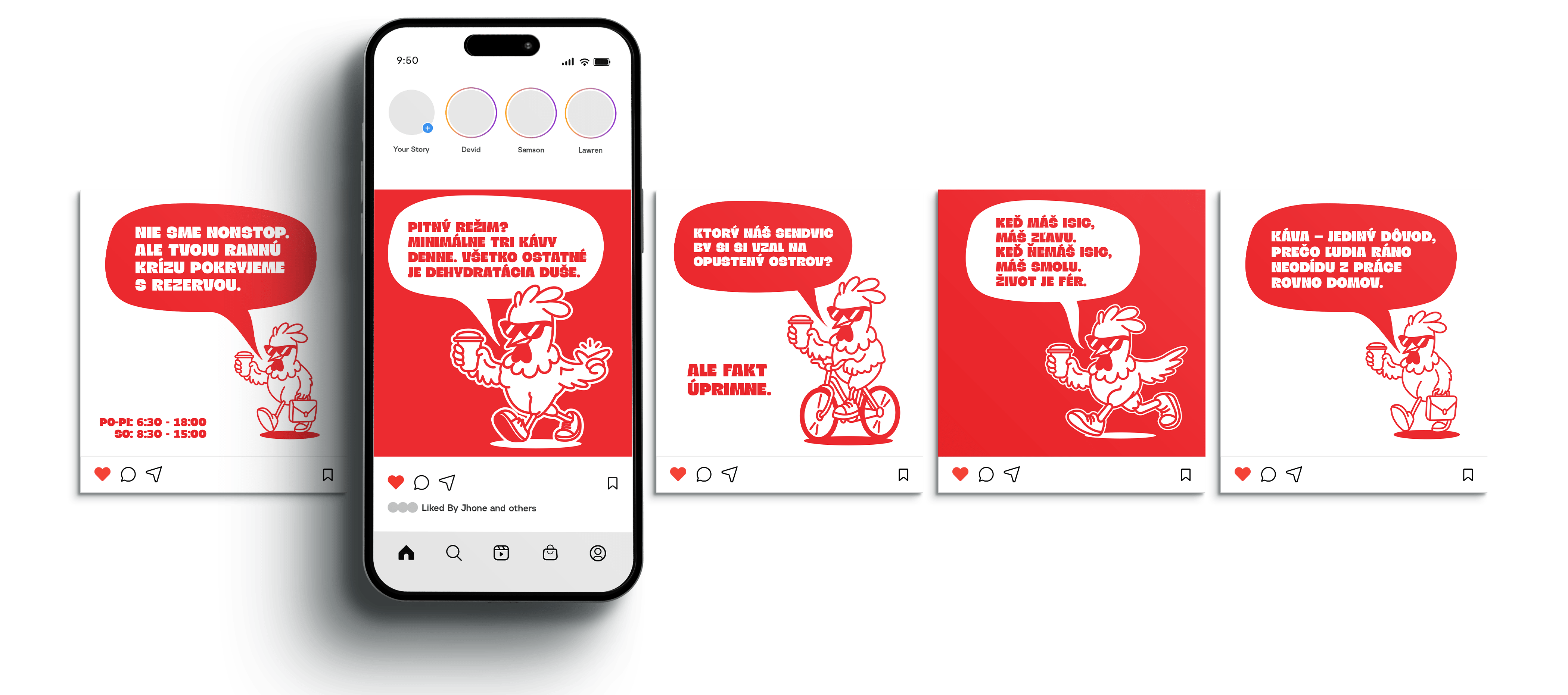 Komunikácia značky je priateľská, energická a jemne ironická – ako samotný kohút, ktorý vie kedy zakikiríkať, no nikdy nie je dotieravý.